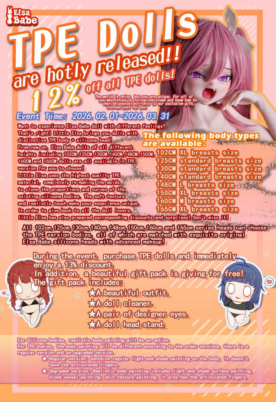 Elsa Babe má jedinečné vysoce kvalitní sexuální panny s několika nejnovějšími vylepšeními. Jejich panenky jsou k dispozici jak ve variantách v plné velikosti, tak v miniaturním formátu. Pro ty, kteří mají rádi mangu a anime, nebo dokonce hentai, je určena panenka od společnosti Elsa Babe perfektní volba! Elsa Babejeho panenky mají velmi realistická těla, ale hlavy mají často více či méně surrealistický nádech. Pro ty, kteří sbírají menší panenky, tu máme Elsa Babe široká škála "zmenšených žen"!