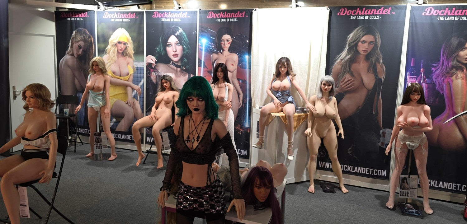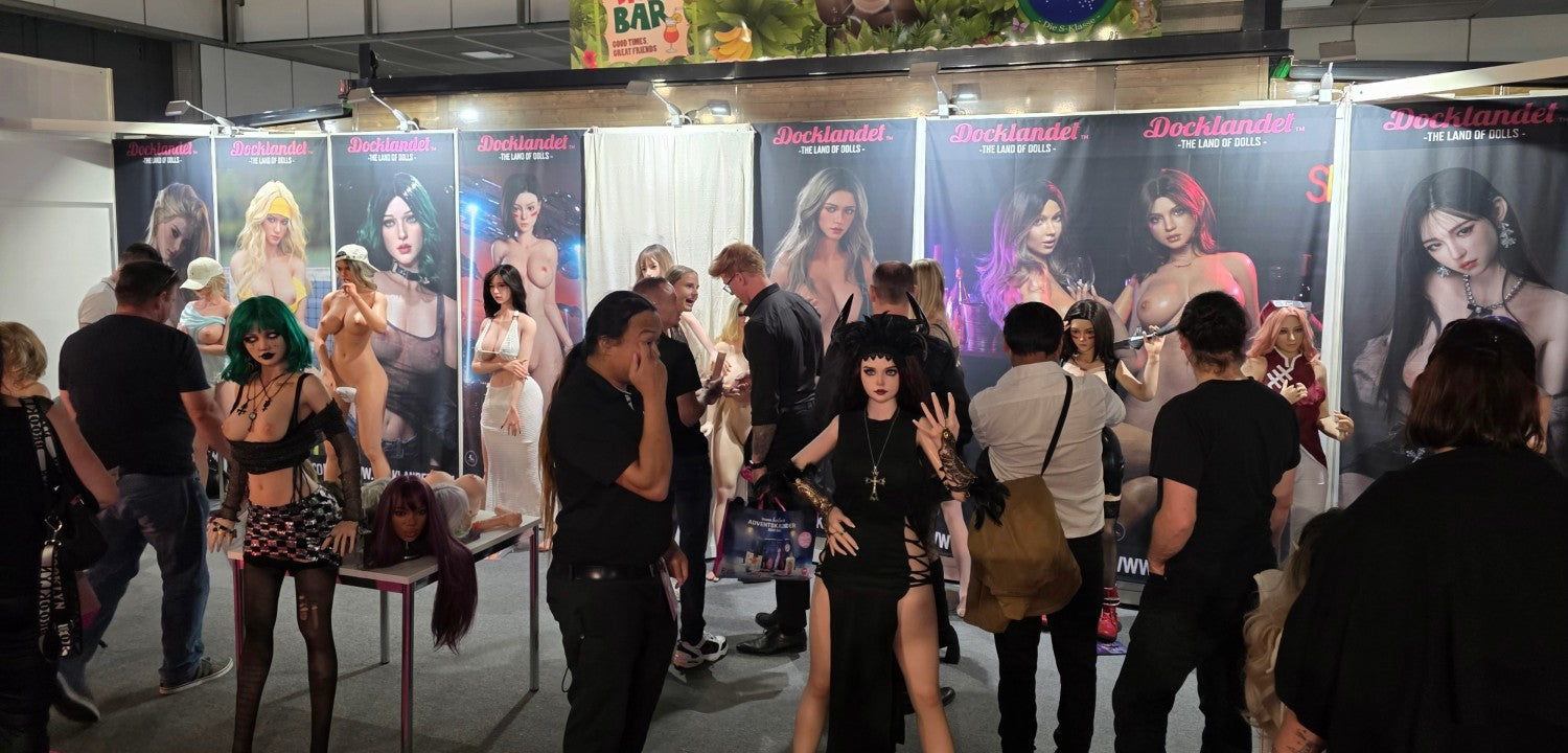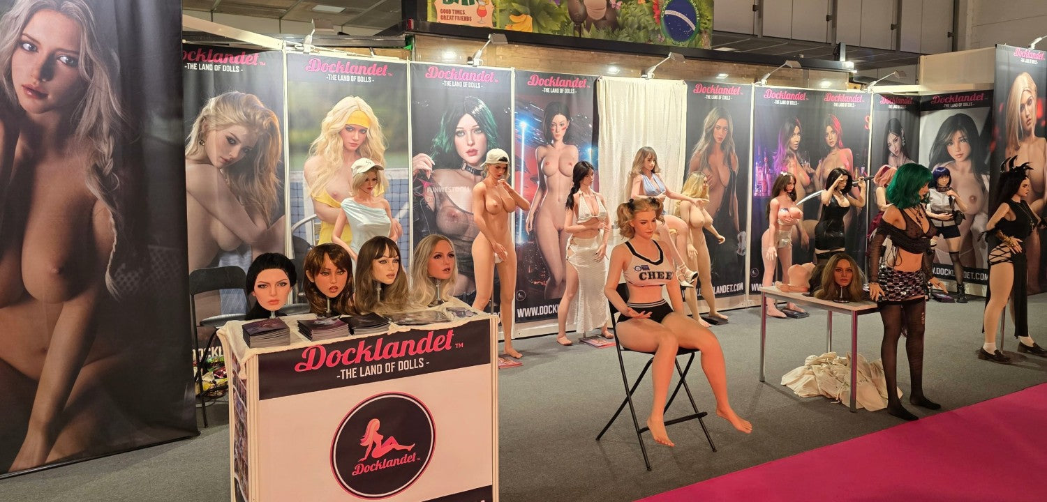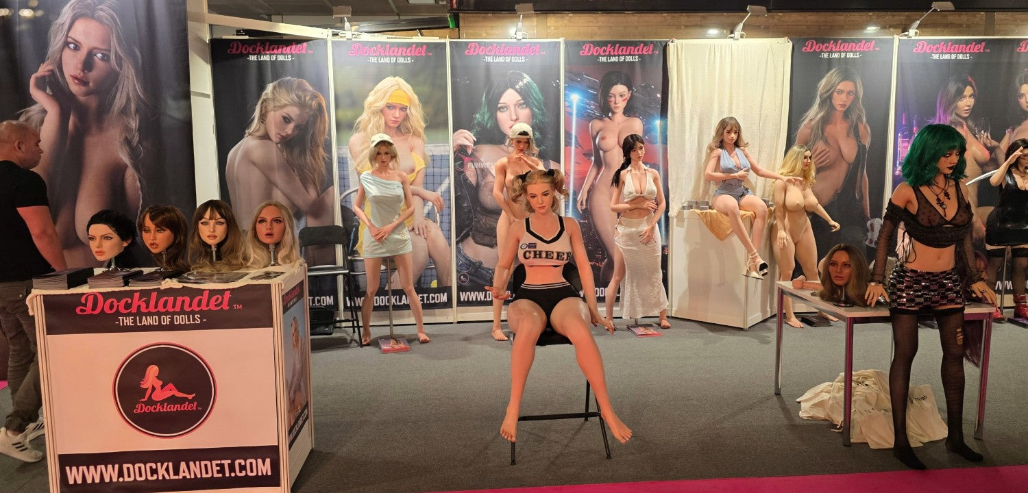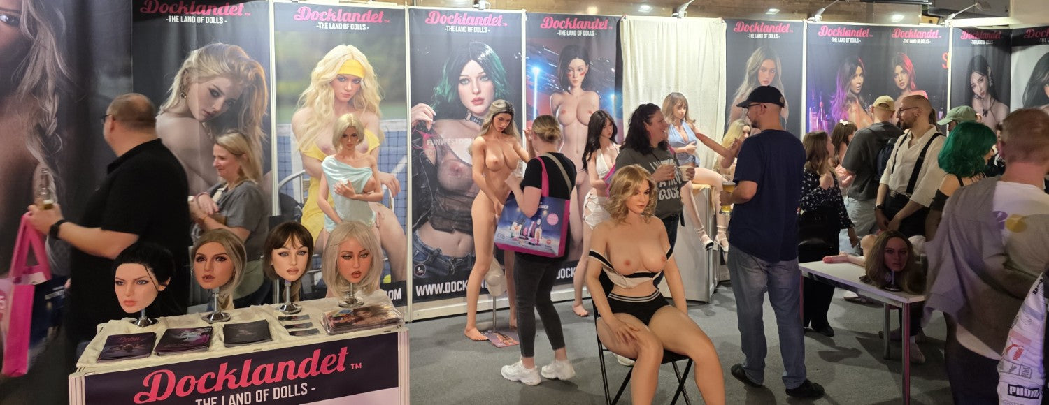 My v Docklandet reprezentovali někteří z našich hlavních partnerů se svými krásnými panenkami. Z TOP-CYDOLL jsme měli 3 plně silikonové panenky, Isabellu, Polly a Zhimin (zleva doprava). uprostřed máme Tracy.B od SE-Doll který je S-TPE a navzdory své nízké ceně je skutečně nádherný. Pak tu máme Noa od nové značky LilyDoll (úzký vztah s SE-DollCenově dostupná a kvalitní hybridní panenka s křivkami těla z materiálu S-TPE a realistickou silikonovou hlavou. Poté si prohlédneme silikonovou panenku "Lita.A", exkluzivní panenku od společnosti Lita. SE-Doll ve stylu inspirovaném postavou Ality. Pak tu máme Sakai z Elsa Babe se třemi ňadry, vždy oblíbená zejména mezi těmi, kteří panenky dosud neviděli. V pravé části stánku pak máme dvě cosplay panenky od firmy FunWest Doll. "Sakura" a "Hinata" s nindža stylem inspirovaným japonským seriálem Naruto. POZNÁMKA! Cosplay znamená napodobování stylu, cosplay panenky nejsou oficiální licencované produkty. O kousek dál ve stánku jsme měli rozestavěné 3 panenky a celou řadu hlav. Irontech Doll's Eila Adams, který vznikl ve spolupráci se skutečnou pornohvězdou Eilou Adams. Eila, známá také jako "nahá reportérka", navštívila veletrh již v minulosti, ale letos byla přítomna pouze její verze panenky. Ještě že jsme panenku přivezli pro všechny fanoušky Eily! Uprostřed stánku vidíme Silvanu (Wushi custom) z filmu Starpery. Zcela vpravo pak máme Lily s gotickým stylem od FunWest Doll.
